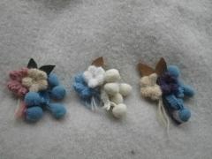 淡い生成りとベージュのトーンのブローチ、グリーンが一番好き!と元気なグリーン系のブローチ。姉妹でも、それぞれの選択がほほえましいです。