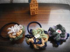 色々な色で鎖編みを編んで、お花にまとめたヘアゴムです。
