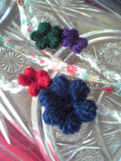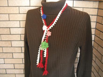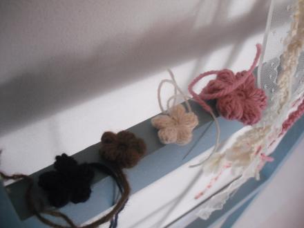 毛糸のブレードに、お花をつけて、クルンとしばってネックレスになります。