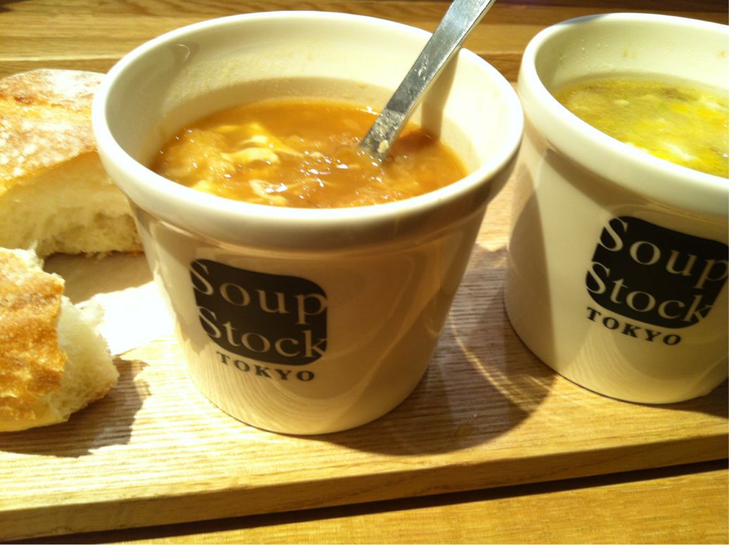 たまねぎのスープと、グリンピースと半熟たまごのスープ
