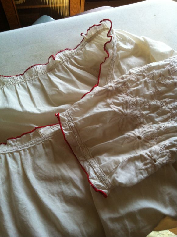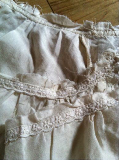 切りっぱなしに、ギャザーをよせて、同じ素材のレースを叩いてワンピースを作ったんです。