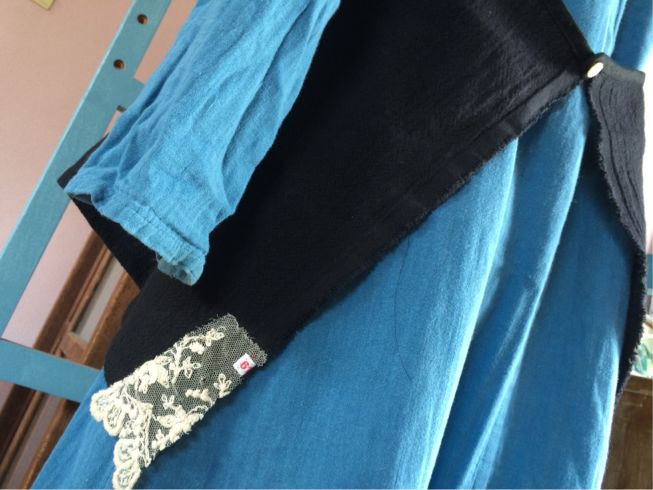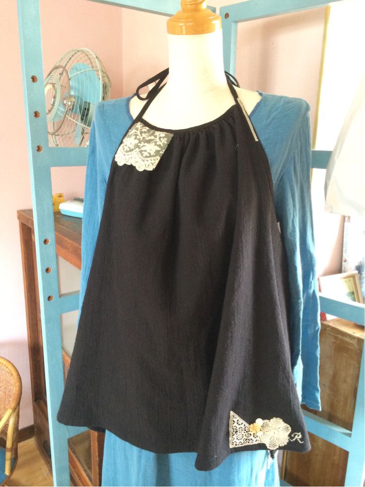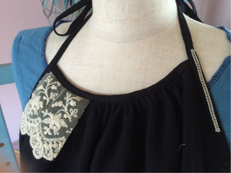 ブラックリネンとアンティークレースで作ったのはキャミエプロン。