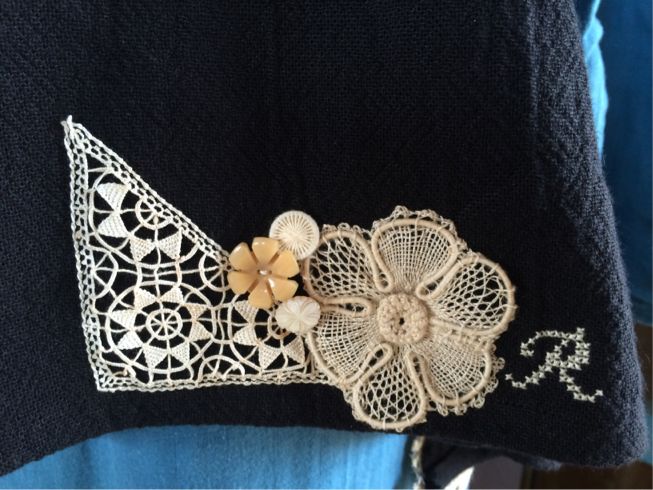 一緒に縫いつけたボタンもヨーロッパのアンティークで濃いミルク色のシェルボタンがレースと相性がよくて合わせた時に、この子しかいない!!