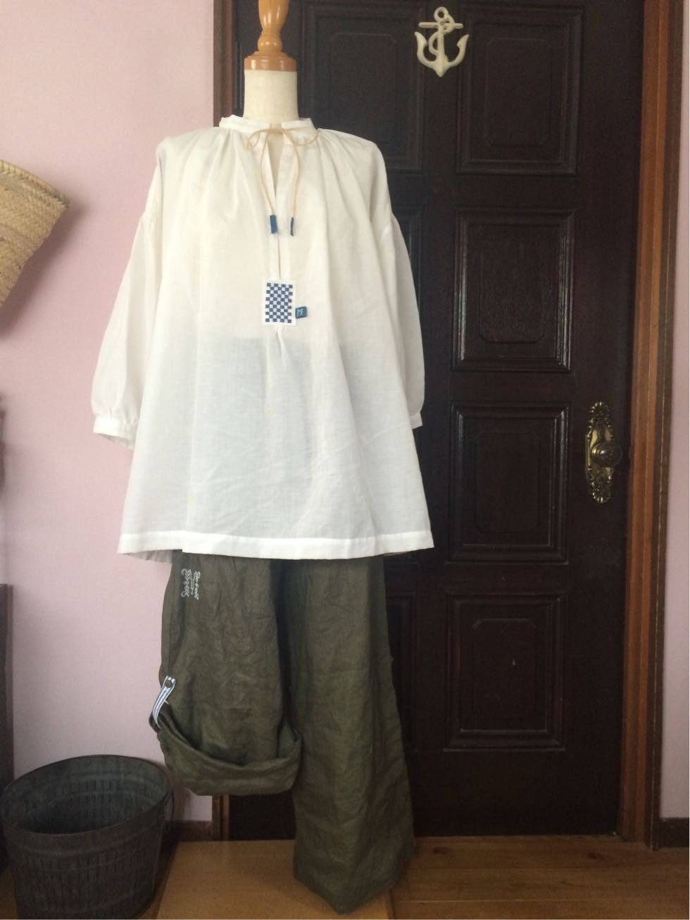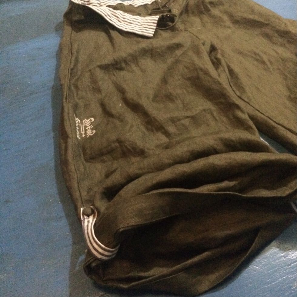 パンツはオリーブグリーンのリネン