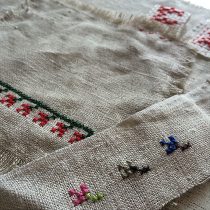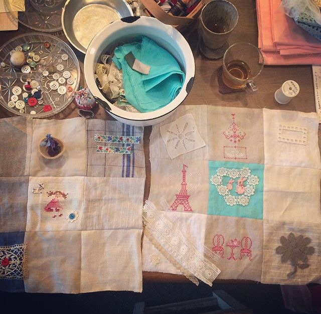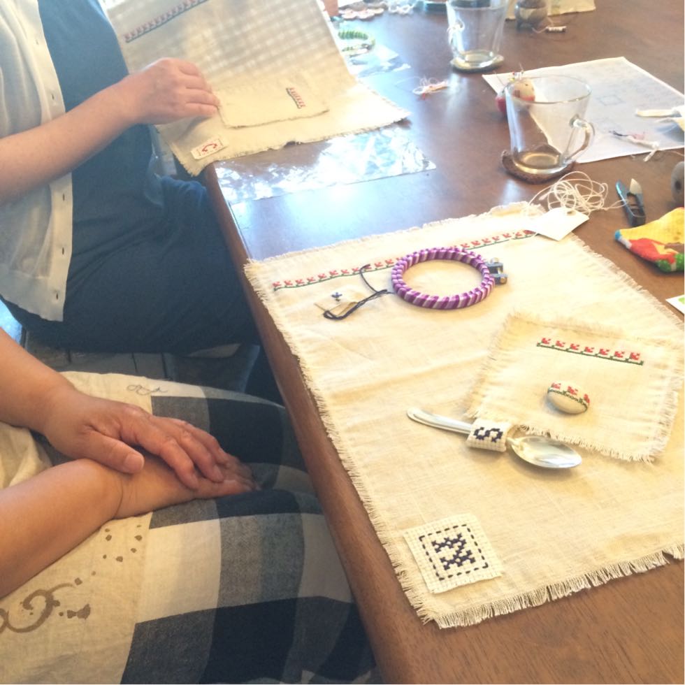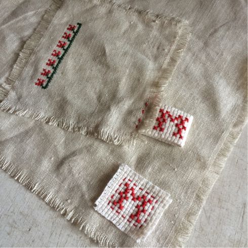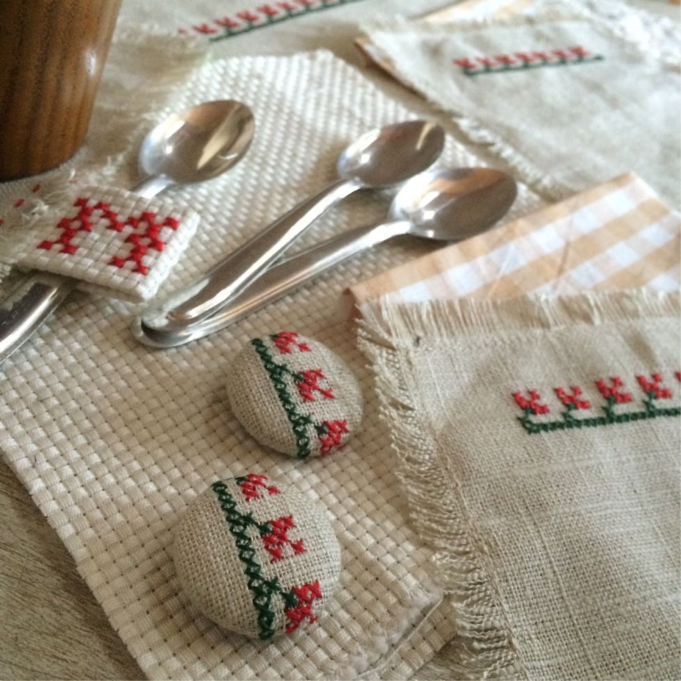 あらかじめステッチしておいたリネンのコースターとランチマットに