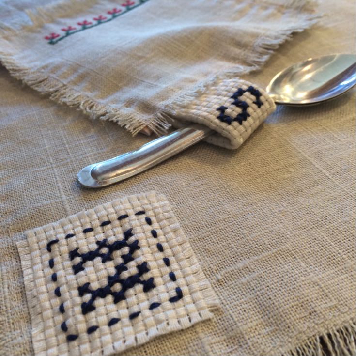 初心者の方でも刺しやすいステッチ用の布にお好きなイニシャルをステッチして、コースターとランチョンマットを仕上げます。