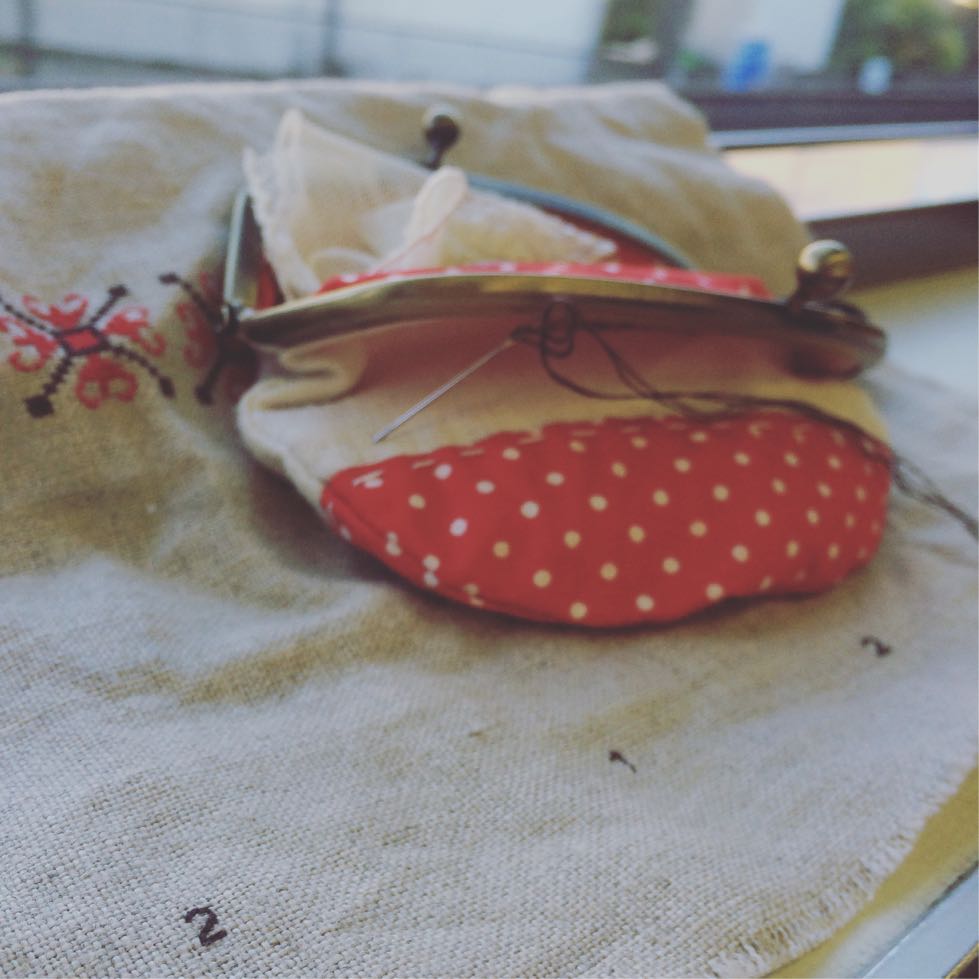 どこに行くにも持ち歩く刺繍セット(編み物セットの時もある)小さなちいさな1、2、3の刺繍をしながらちょいとお出かけ(*^^*)