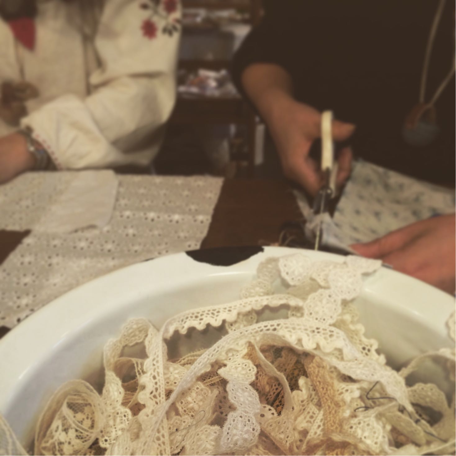 レースやハギレをチクチクコラージュして、、、、