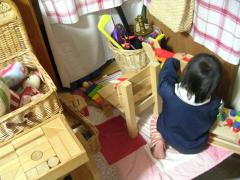 と、イスを持ってきて積み木やボールを下ろしてご飯をたべていました。