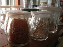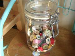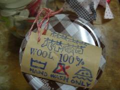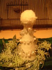 確か青のりが入ってたビンに、白い毛糸をぐるぐる巻いて、(はじめと終わりは両面テープで固定しました。)上にポンポン。ワイヤーにビーズを通してグルグル巻きました。