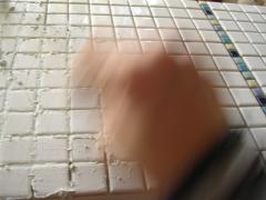 このあと、濡らしたスポンジで表面を慣らして、ふきんでタイルをきれいにしてます。きゅきゅっと磨くとタイルもピカピカ。