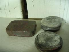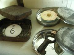 古いカギ、紙のボビン、ほうろうのプレート。小さなアンティークを入れてみました。