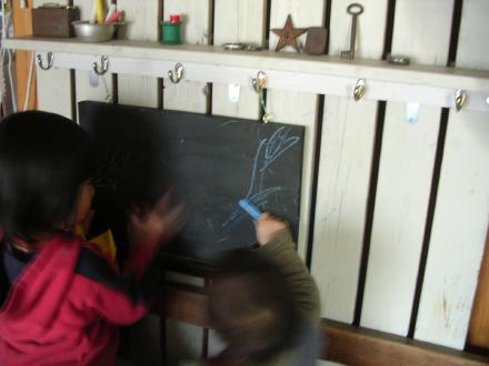 なんだか、迷ってしまって、三男がトコトコと歩き回って、そちらも気になるし、、、決めかねてしまって、↑で二人が落書きをしている黒板だけ、連れてきました。