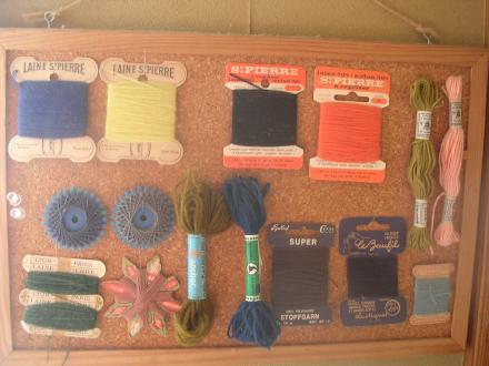 画像は、糸の標本。コルクボードにピンでとめただけです^^。