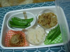 レンコンのきんぴらと、酢蓮、スナックえんどう。