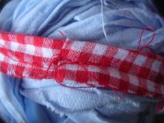 1.5~2㎝くらいで裂いて、端と端を2㎝位重ねて二つ折にして、縦方向に、なみ縫いかミシン。