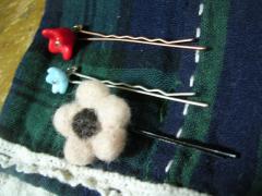 アロマ・ルナ・ヌーヴォーさんのフェルトのお花ピン。マレタケ荘のお花ピンと、兄弟、いや、姉妹です^^。