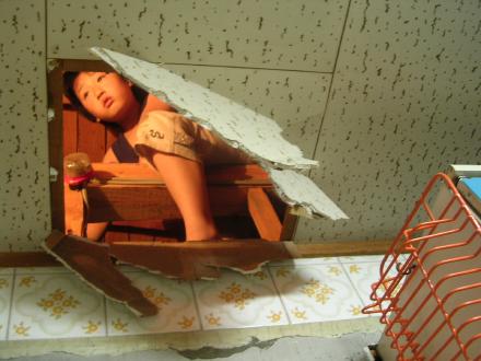「へえ~、家の天井の上ってこうなってるんだ~・・・ズボッ!わ~!!!」