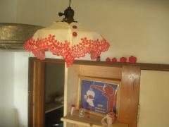 ランプシェードにカットワークのアンティークリネンのつけ衿をふわっとかけてあって、