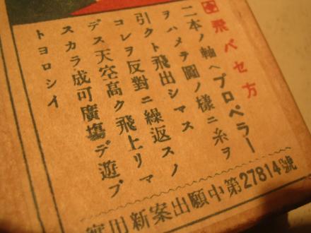 「二本の軸へプロペラーをはめて図の様に糸を引くと飛びだします。