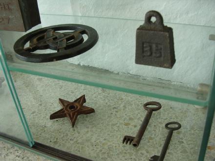 玄関に置いてあるガラスケースの中の古いカギが並んでいます。