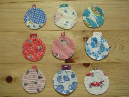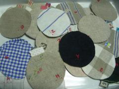 リネンとフィードサックで、丸いコースターを作りました。