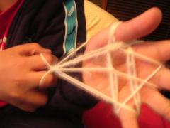 長男、腕がつりそうになりながら、鉄橋→カメ→ゴム→魚と変わるひとりあやとりをマスター。