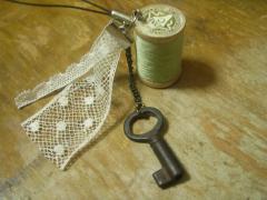 アンティークキー、フランスの小さな木の糸巻き、繊細なレースのストラップ。