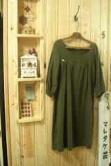 モスグリーンの5分袖ワンピース。こちらも重ね着しやすい丈です。
