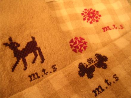クロスステッチでちょうちょ、幾何学模様、バンビに「m・t・s」マレ・タケ・ソウ。どれが届くかは、お楽しみ♪
