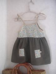 お祝いに、ヨシエちゃんの家にあった、ノスタルジックな花柄の生地に合わせて、家で見つくろったモスグリーンの3重ガーゼと、はぎれ数種類、conoriさんのキャミワンピのパターン持参のワタシ。