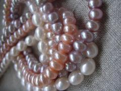 淡水パールは淡水性の貝の中に出来る真珠で、養殖の際に核を挿入しないため、まんまるにはならず、ライス型やドロップ型など、いろいろな形になるそうです。