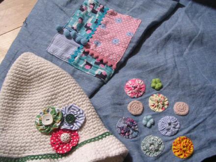 帽子はずいぶん前に編んだものですが、昭和の古い布と古いボタンを使いました。