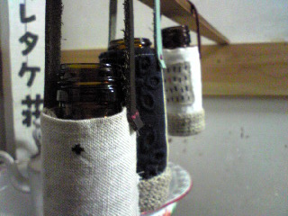 茶色の遮光ビンに、リネンの糸とリネンの端切れでカバーを作りました。