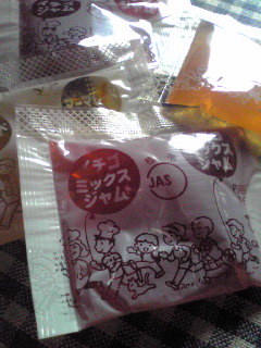 ツヤツヤピカピカのバターロール3つ^^。給食のジャム4種類にアルミのスプーンのセットです。
