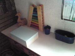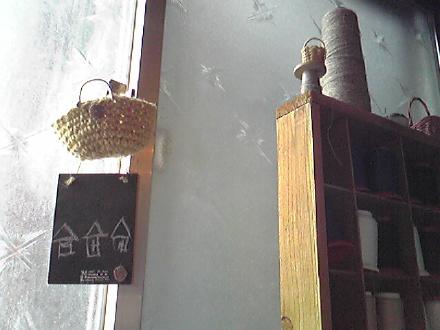 ミシンコーナーの後ろの出窓。細かい材料を置いています。