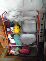ここに、オレンジのラックを置いて、ほうろう入れ物を集めて置いてみました。