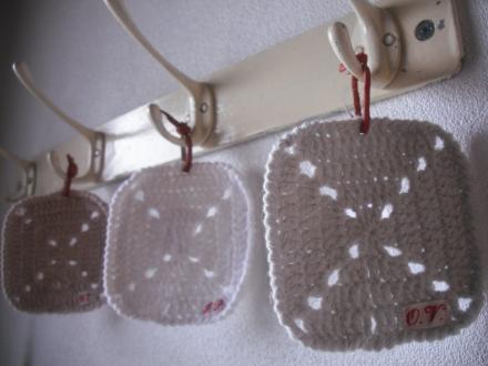 ラミーとリネンの糸で編んだコースター。革ひものループが付いてますのでフックに下げてストックしておけます。GOURD+mさんに納品しました。