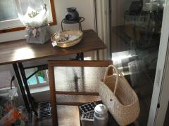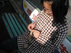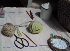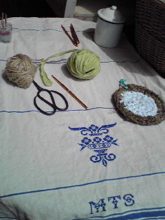 お庭のすみのベンチで、裂き布をたくさん用意してアミアミしていました。