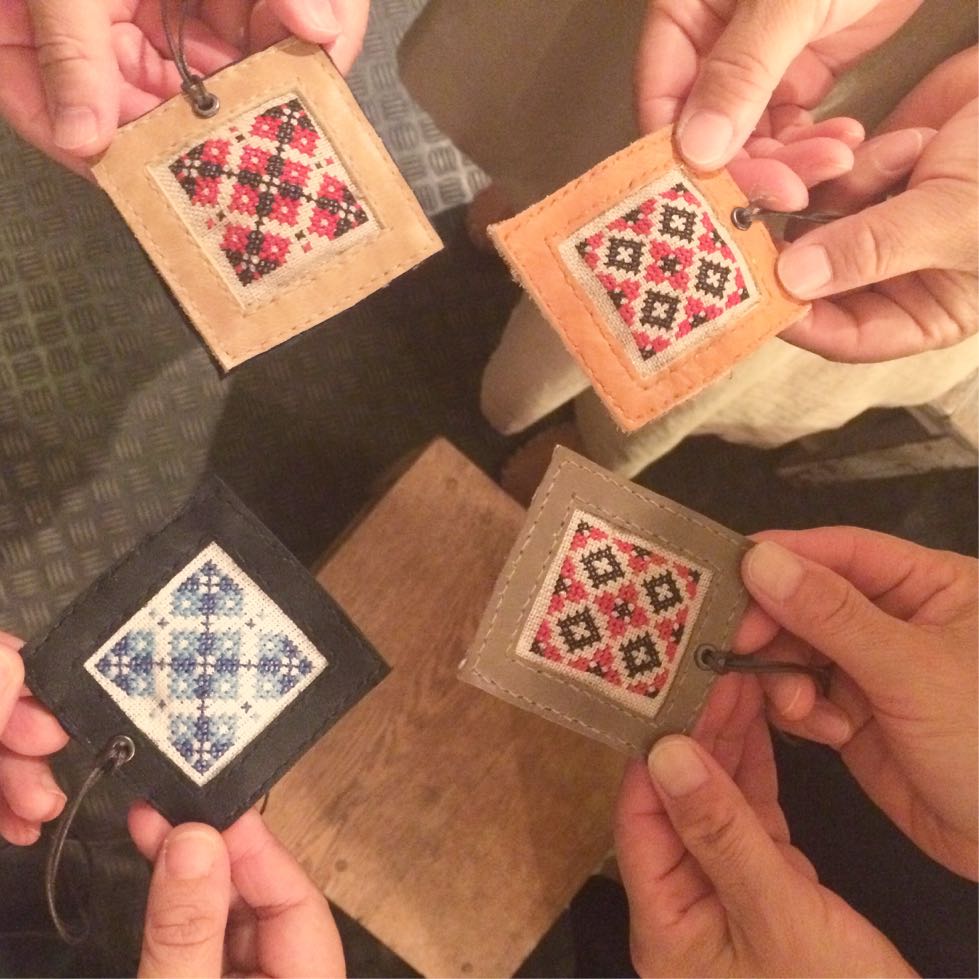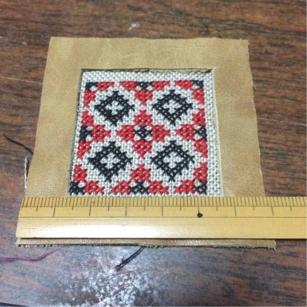 刺繍糸をロウ引きして開いてる穴めがけて縫い合わせていきます